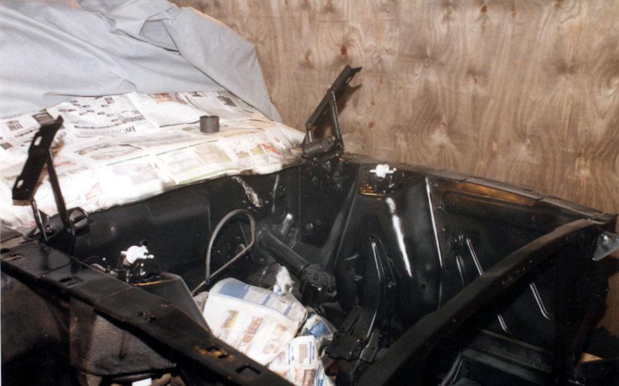 Spraying the transmission dipstick, power-steering pump and shocktower covers, then the engine bay with the shocks fitted back in.