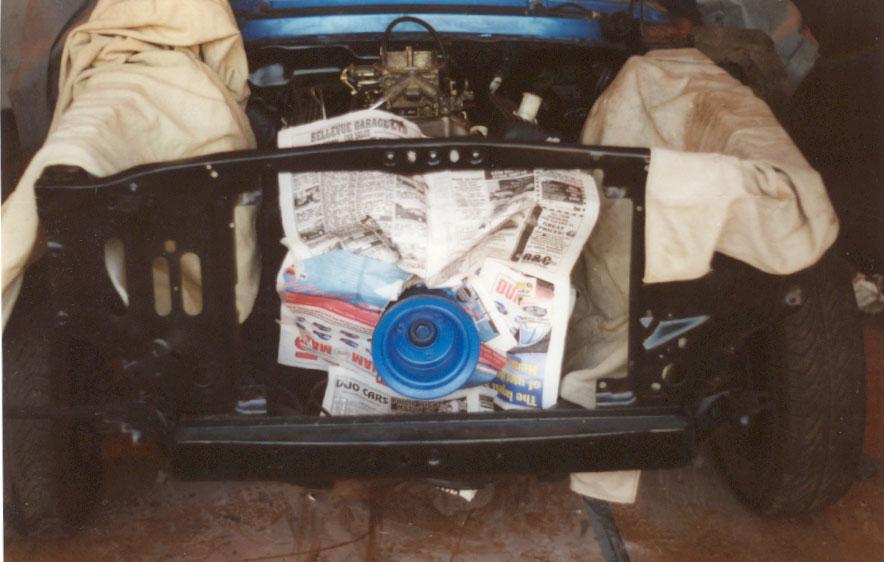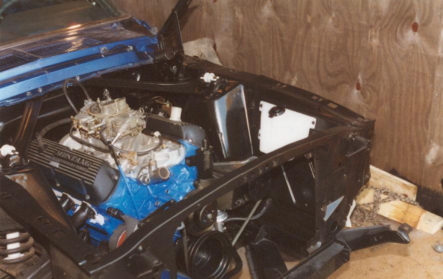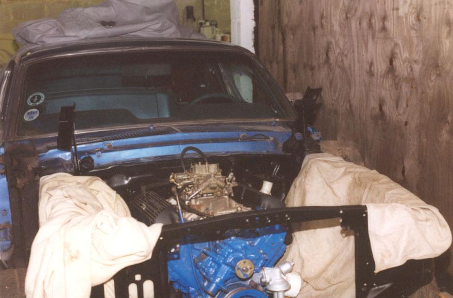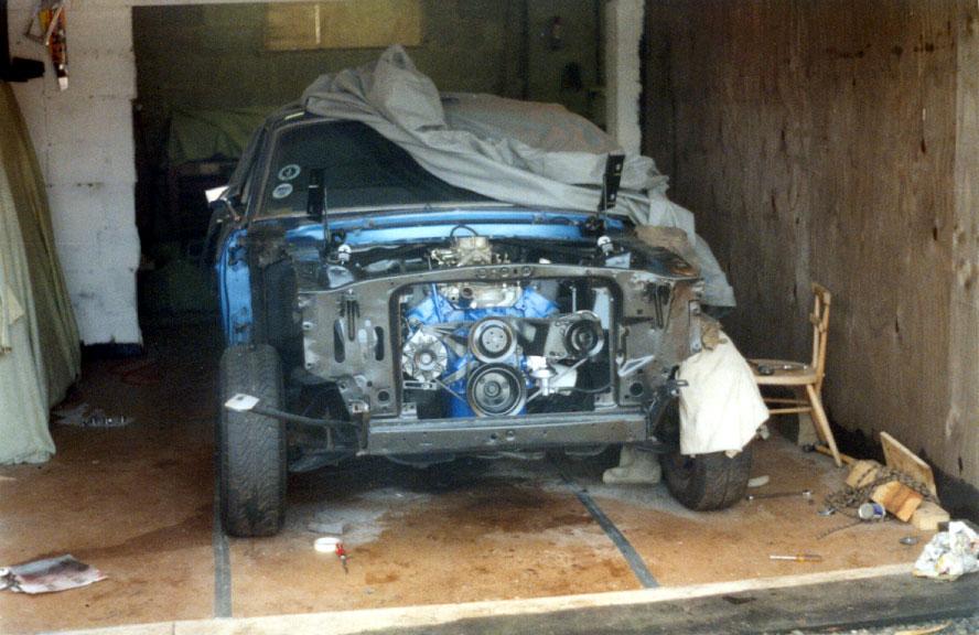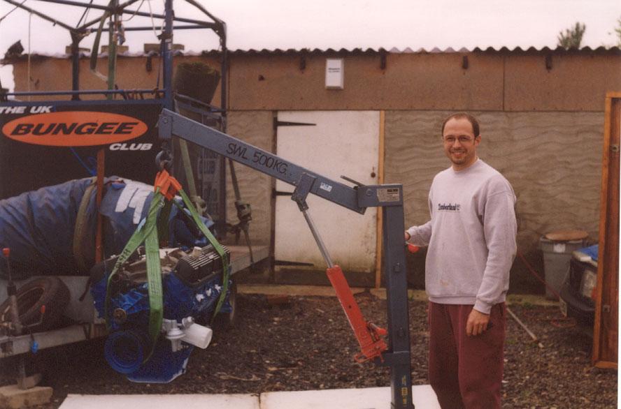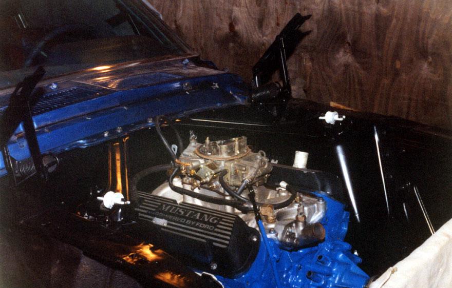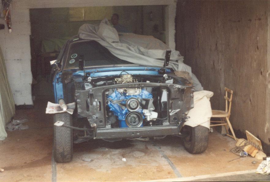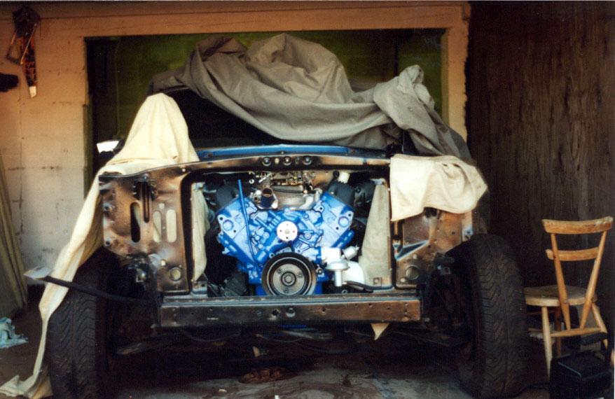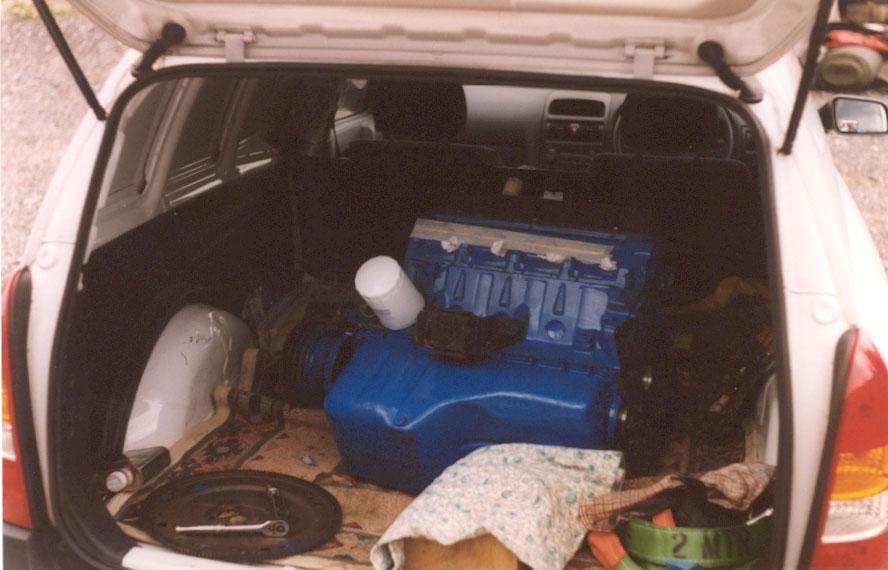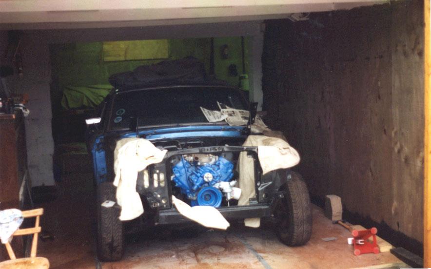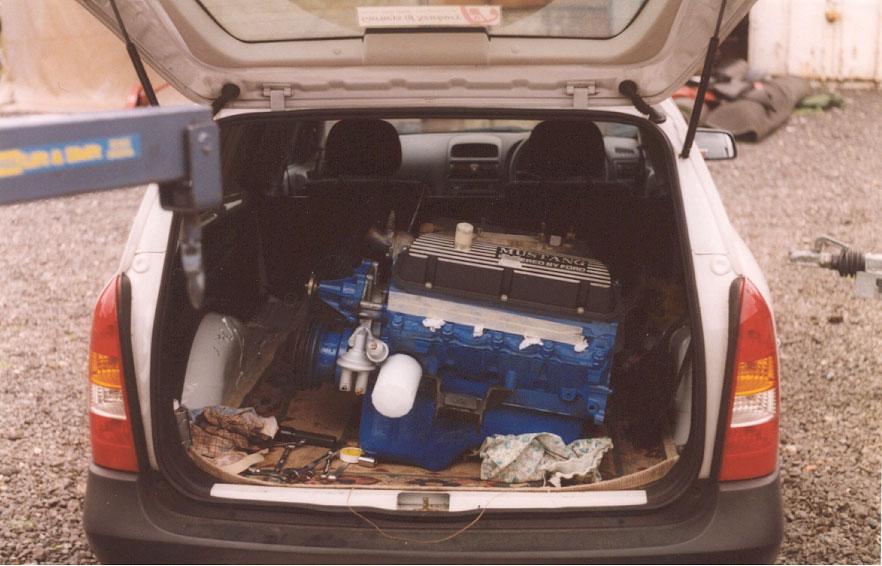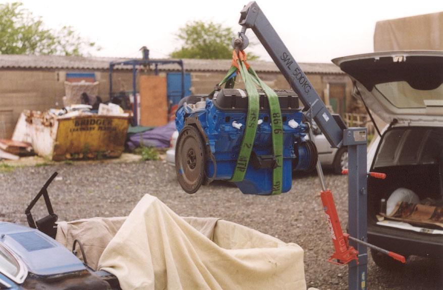 The engine, rebuilt by Bob Harmen Performance with Mark helping me fit it back into the car.